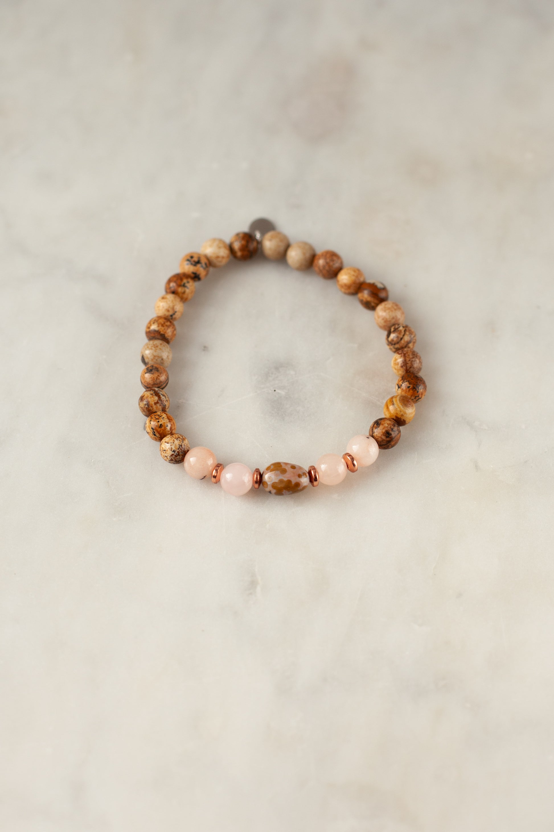 Des perles de jaspe paysage de six millimètres encerclaient son poignet comme de minuscules paysages : des déserts doux, des ciels paisibles, des chemins qui semblaient s’écouler sans hâte. Chaque pierre paraissait murmurer la même chose : tu n’es pas en retard. Tu es guidée.