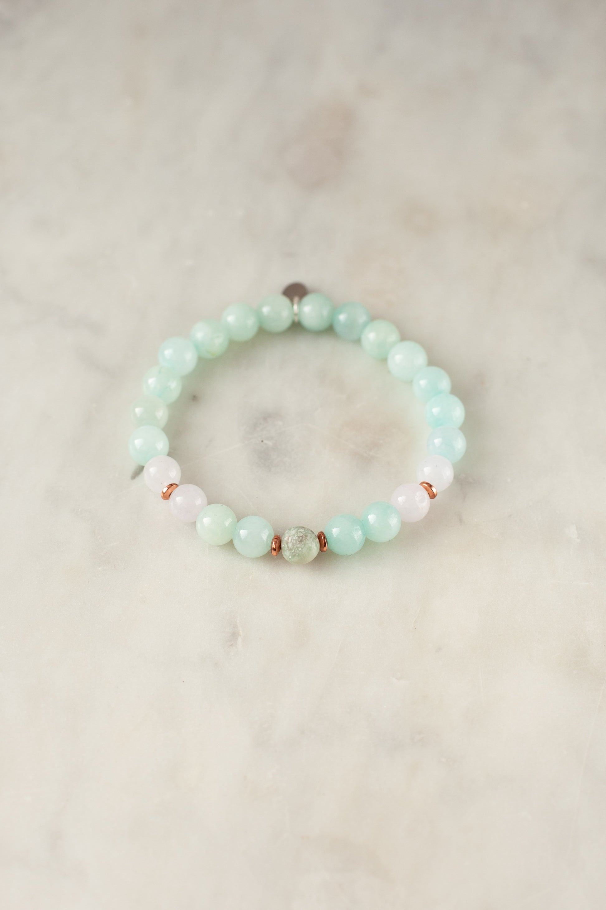 Soft blue 8mm amazonite beads wrap her wrist, a gentle reminder to notice the light. Always Seeing the Good guides her to pause, breathe, and let gratitude color every moment.