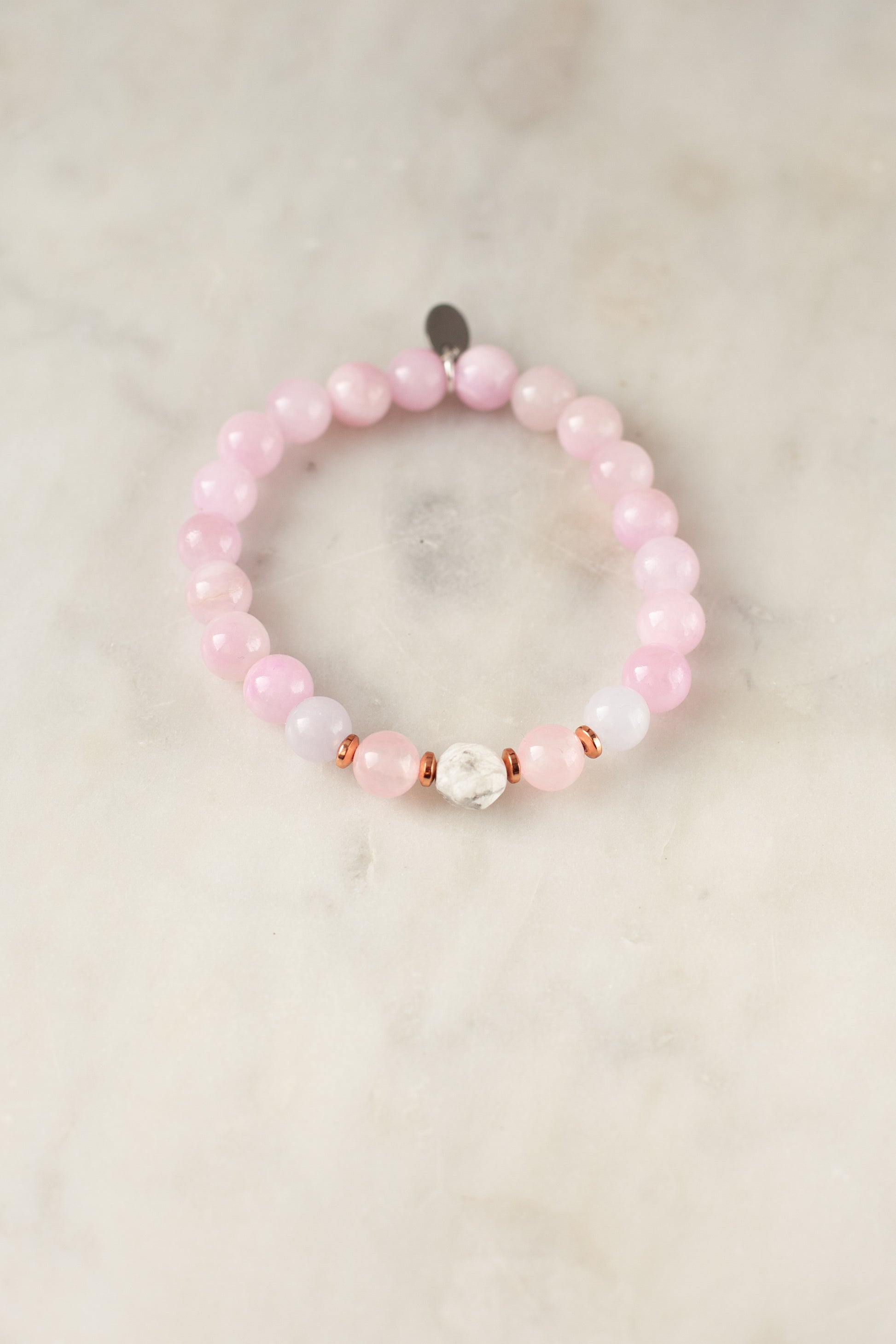 The lilac jade carries the frequency of quiet joy — not loud, not forced, but real. At its center, the howlite stone softens the mind and reminds her to breathe, to notice the little delights, to return to her natural glow.