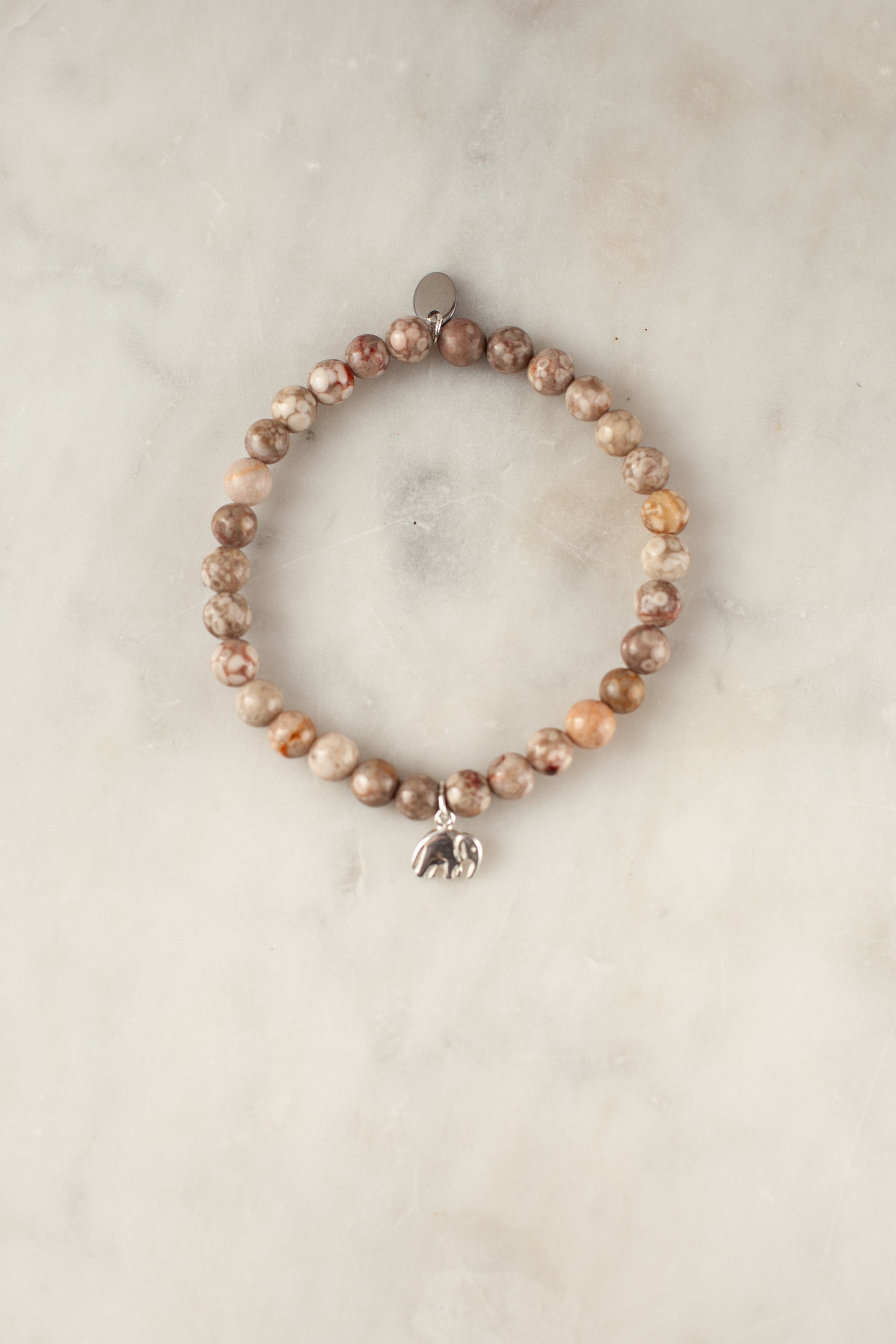 She wears this bracelet as a quiet reminder to move through life with steady grace. The earthy 6mm jasper beads ground her, while the 925 silver elephant charm whispers strength, patience, and gentle wisdom. With every step, she feels rooted yet free, trusting her path and moving in harmony with the rhythm of the world.